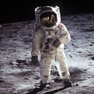Astronautul Buzz Aldrin pe suprafața lunară în Marea Liniștii în timpul misiunii Apollo 11. Fotografie realizată de Neil Armstrong, comandantul misiunii.