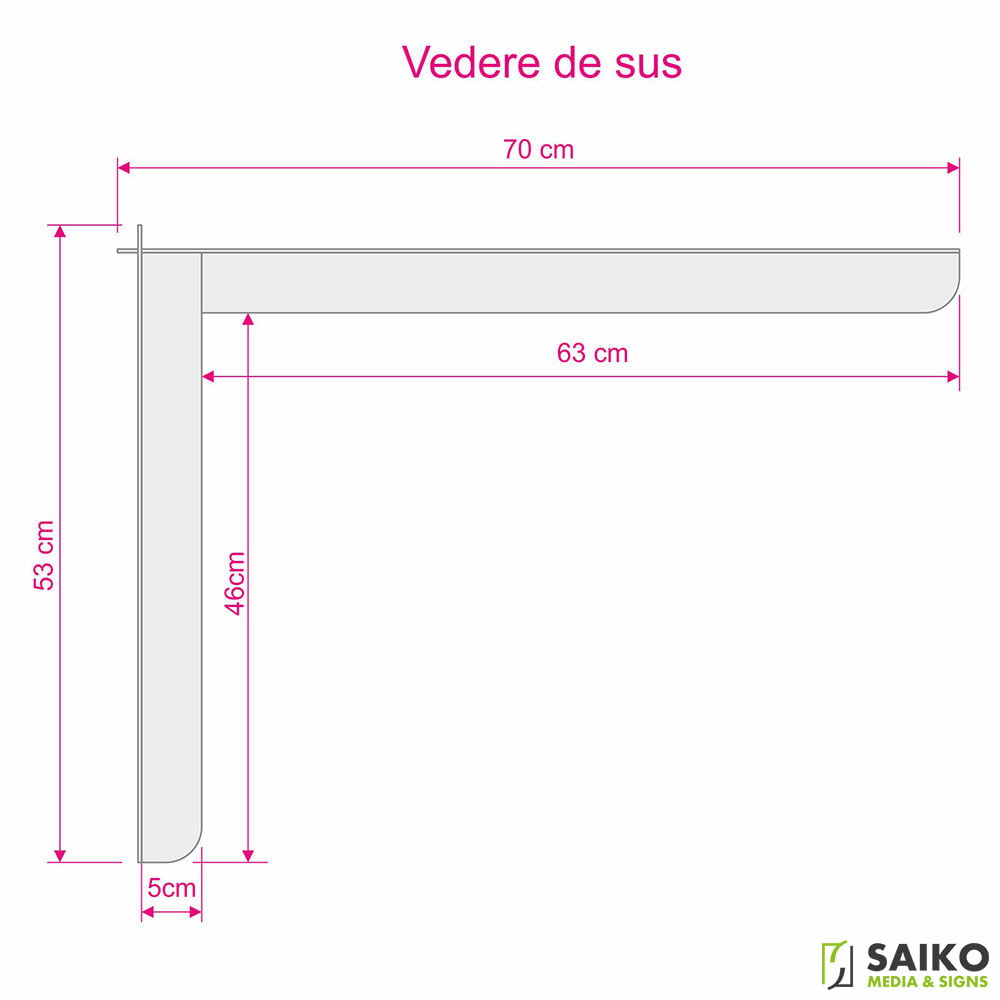 Dimensiuni: 70 cm lungime x 53 cm adâncime x 50 cm înălțime. Tălpi de 3 cm în partea de jos, obținute prin termoformare, prevăzute cu bandă dublu adezivă pentru fixarea pe masă/ birou/ bancă.