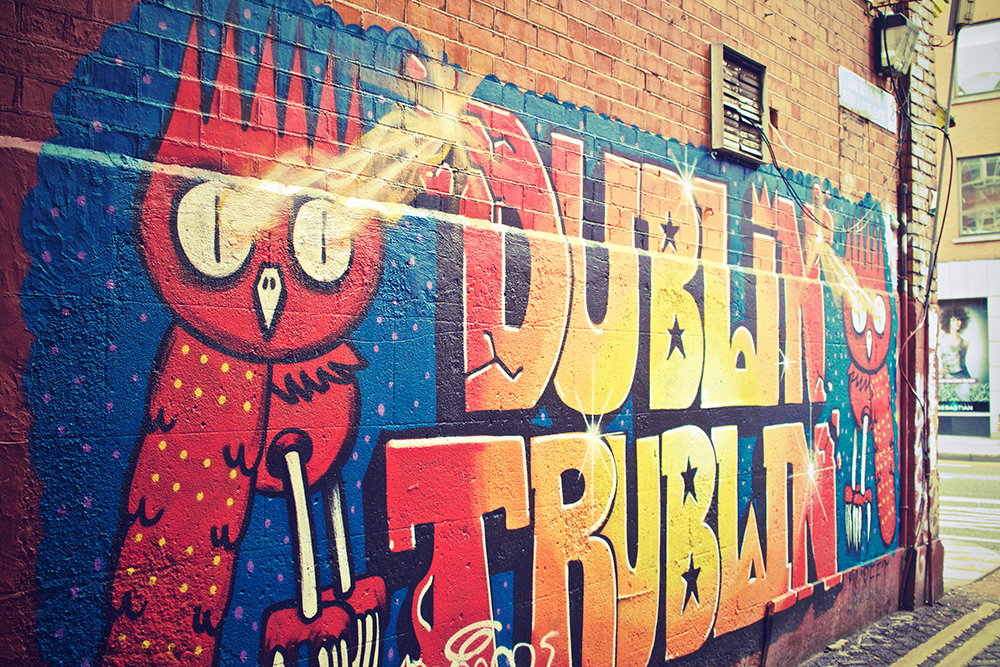 Graffiti stradal pe o clădire de cărămidă cu două bufnițe roșii din care ies raze de foc și textul ”Dublin Trublin”.