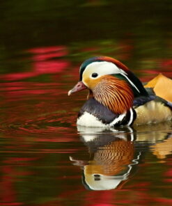 Rățușcă sălbatică ce înoată pe un lac în reflexia căruia se văd nuanțele roșii și verzi ale vegetației înconjurătoare.